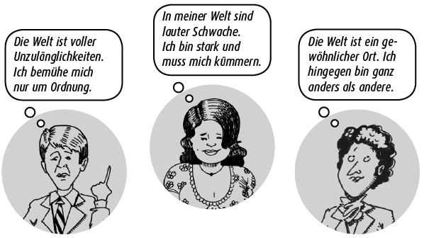 In den drei Cartoons oben sehen Sie als Beispiel Denkmuster von Typ 1 (Perfektionist:in), Typ 8 (Boss) und Typ 4 (Individualist:in).